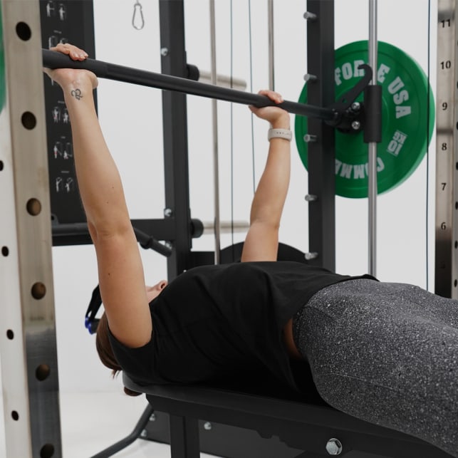 The Smith machine is a complement to a power rack. It enables beginners or people training on their own to practice free weight movements. It looks similar to a half or power rack, except that the barbell is fixed on vertical runners. Some machines do also allow forward and backward movements.